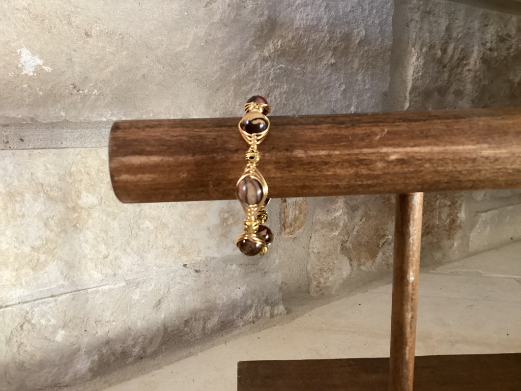This unusual Outback Jasper bracelet was designed with care. It combines gold spacers and beads woven with gold colored copper wire with a herringbone weave design on a memory wire. Outback Jasper is a lovely sedimentary rock composed of brown, red, and pink Jasper. It is found exclusively in the Outback, a remote and sparsely populated area in Australia. The woven beads are 10mm.