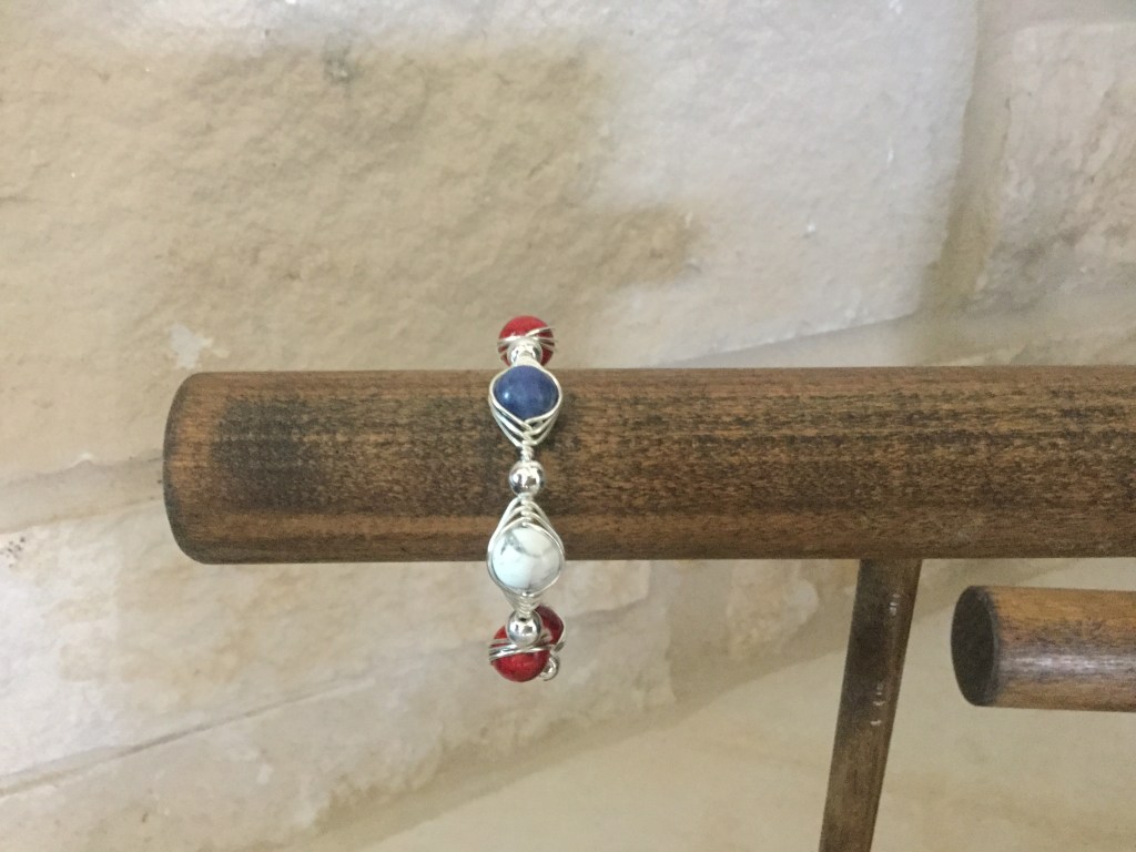 This bracelet was designed with care. It combines silver spacers and Bamboo Coral (red), Natural Howlite,(white) and Sodalite (blue) beads woven with a herringbone weave design on a memory wire. Bamboo Coral was discovered in 2005 on seamounts in the Pacific Ocean. This stone can also be found in the Gulf of Alaska. Howlite is a borate mineral originally found in Nova Scotia. It was discovered by miners in a gypsum quarry, who found it to be a nuisance. Sodalite was originally discovered in Greenland in 1806. Larger deposits of gem quality material were found in Ontario, Canada in 1891. The woven beads are 10mm.