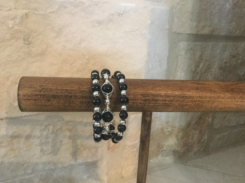 This unique Triple Strand Bead Bracelet was designed with care. It combines a herringbone weave strand and beads/spacers on the other strands. The onyx gemstone comes in several colors but the most common is black. Onyx has a 6.5 to 7 rating on the Mohs hardness scale. It can be found in Uruguay and Brazil. Beads used on woven strand are 10mm. Beads used on single strands are 8 mm.
