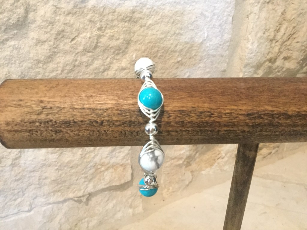 This unusual Blue/White Howlite bracelet was designed with care. It combines spacers and beads woven with a herringbone weave design on a memory wire. Howlite was originally discovered in Canada but today large amounts are mined in California. Howlite is a porous stone and somewhat soft on the Mohs scale. The woven beads are 10mm.