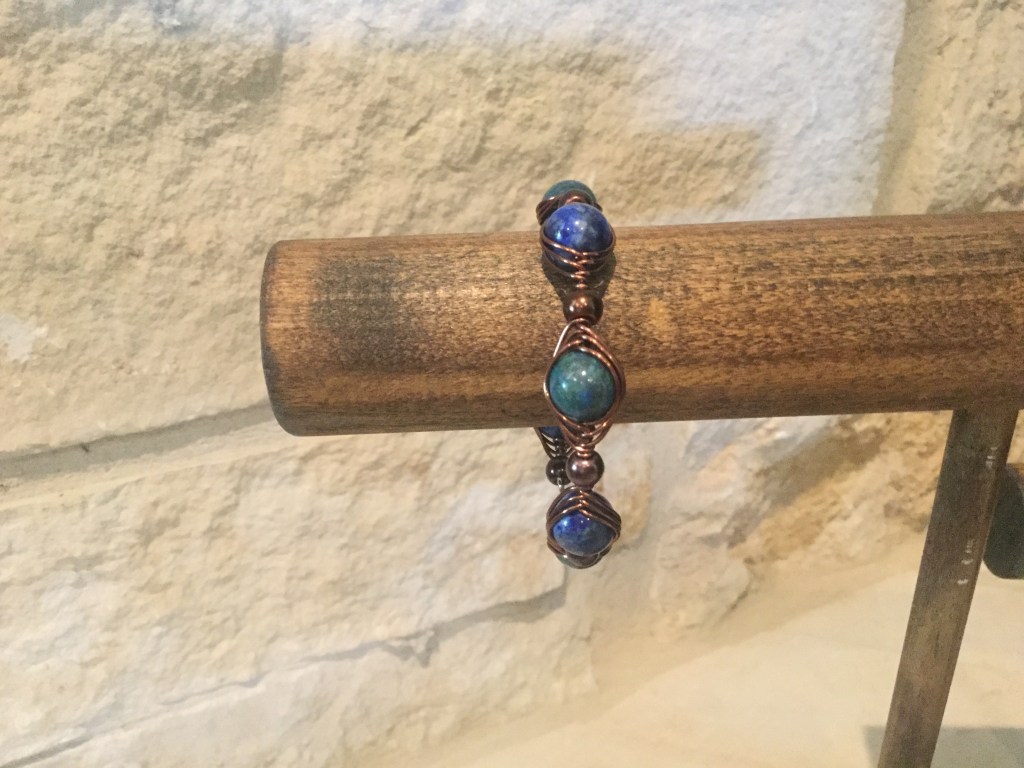 This unusual Chrysocolla bracelet was designed with care. It combines antique spacers and beads woven with a herringbone weave design on a memory wire. Chrysocolla has a cyan (blue green) color and is associated with copper ore. It is a product found anywhere that copper is being mined. The woven beads are 10mm.