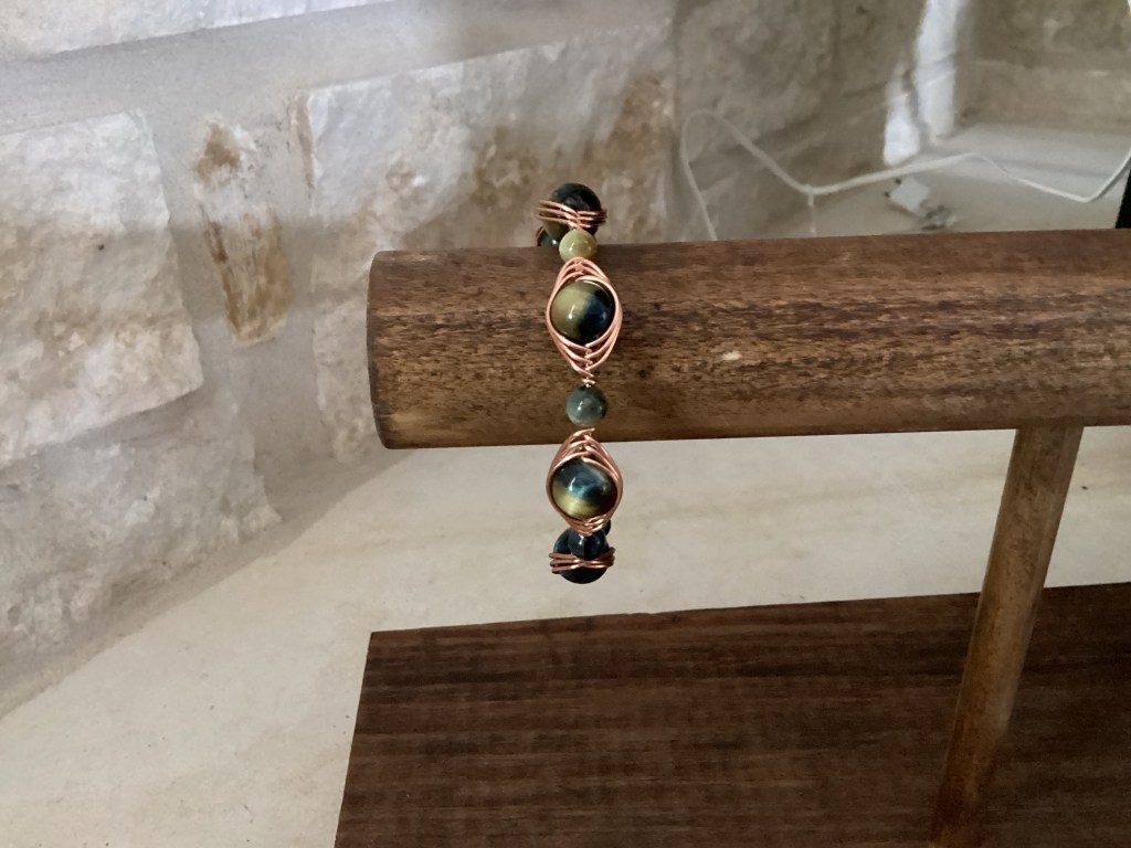 This unusual Falcon’s Eye bracelet was designed with care. It combines 6mm Falcon’s Eye beads and 10mm Falcon’s Eye beads woven with a bright copper wire herringbone weave design on a memory wire. Falcon’s eye or blue tiger’s eye is a fascinating and unique gemstone. This semi-precious gem distinguishes itself with blue-gray to bluish-green color, with a chatoyant quality. It can be found in Arizona and California in the US and in South Africa, Brazil and Namibia.