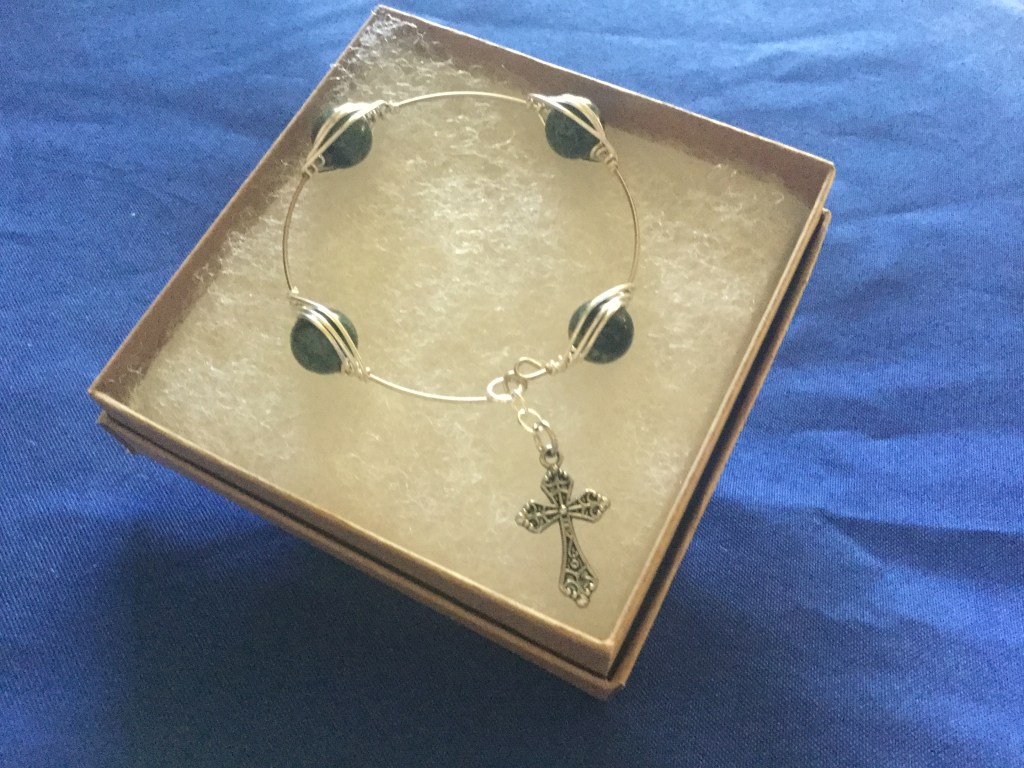This Blessing Bracelet was designed as a reminder to think of and appreciate 4 blessings each day. Four Kambaba beads are created with a herringbone weave, strung on a memory wire, and embellished with a cross charm. Kambaba Jasper, also known as Green Stromatolite, is an extremely old stone dating back three billion years. Although its called a Jasper, the green and black swirling color stone is a fossil. It formed as a clump of fossilized algae that created this mineral. It can be found in South Africa and Madagascar. The beads are 10mm.