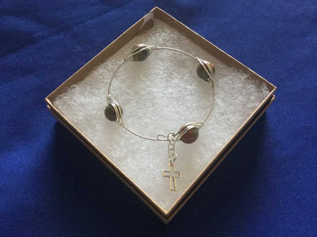 This Blessing Bracelet was designed as a reminder to think of and appreciate 4 blessings each day. Four Unakite beads are created with a herringbone weave, strung on a memory wire, and embellished with a cross charm. This stone is the result of a granite formation of pink feldspar and green epidote. First found in Tennessee and North Carolina, USA; Unakite is also located in Zimbabwe and Switzerland. The beads are 10mm.