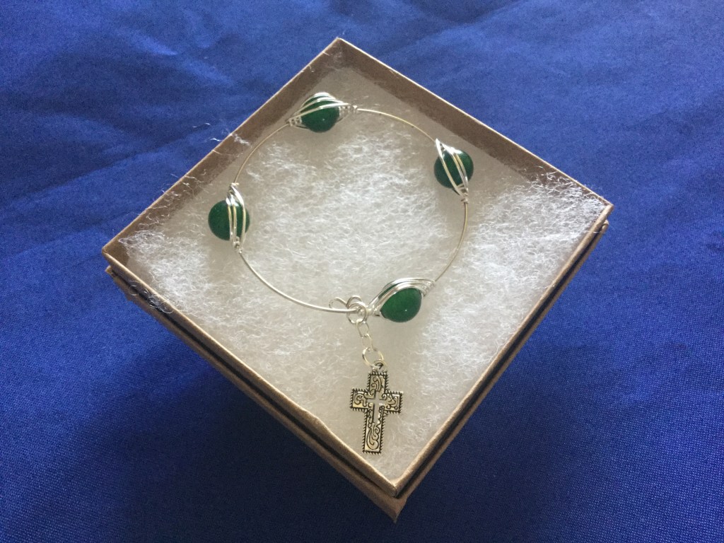 This Blessing Bracelet was designed as a reminder to think of and appreciate 4 blessings each day. Four Jade beads are created with a herringbone weave, strung on a memory wire, and embellished with a cross charm. Jade is best known as a green ornamental stone. Its colors vary from light to dark green. Jade is actually the gemstone name for 2 different mineral forms, Jadeite and Nephrite. The most valuable forms of Jade are semi-transparent. Jade is found in New Zealand, Canada, Russia, Alaska, China, and more. The beads are 10mm.