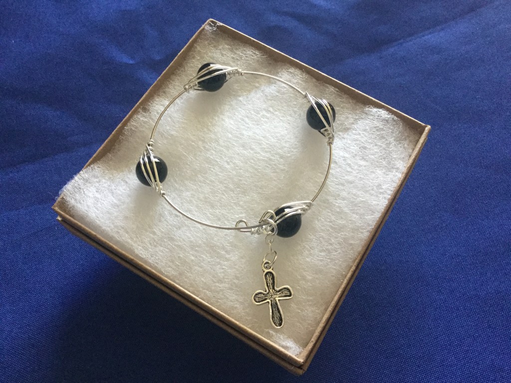 This Blessing Bracelet was designed as a reminder to think of and appreciate 4 blessings each day. Four Black Onyx beads are created with a herringbone weave, strung on a memory wire, and embellished with a cross charm. The onyx gemstone comes in several colors but the most common is black. Onyx has a 6.5 to 7 rating on the Mohs hardness scale. It can be found in Uruguay and Brazil. The beads are 10mm.