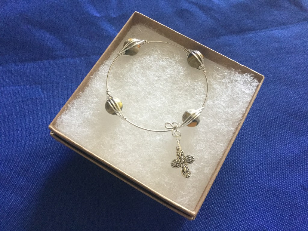 This Blessing Bracelet was designed as a reminder to think of and appreciate 4 blessings each day. Four Bumblebee Jasper beads are created with a herringbone weave, strung on a memory wire, and embellished with a cross charm. Bumblebee Jasper is found in Indonesia. It is difficult and dangerous to acquire because the mine vents are located inside an active volcano. The beads are 10mm.