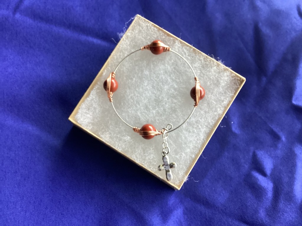 This Blessing Bracelet was designed as a reminder to think of and appreciate 4 blessings each day. Four RED JASPER beads are created with a bright copper wire herringbone weave, strung on a memory wire, and embellished with a cross charm. Jasper is an opaque variety of chalcedony and it comes in a wide range of colors, including red. The most notable location where this semi-precious stone is excavated today is Cave Creek (Arizona, USA). The beads are 10mm.