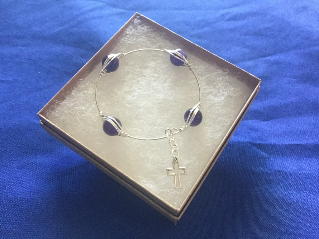 This Blessing Bracelet was designed as a reminder to think of and appreciate 4 blessings each day. Four Amethyst beads are created with a herringbone weave, strung on a memory wire, and embellished with a cross charm. Amethyst is a semiprecious variety of quartz. It is a hard mineral thus suitable for use in jewelry. Amethyst is found around the world with large samples coming from Brazil, South Korea, and Russia. The beads are 10mm.