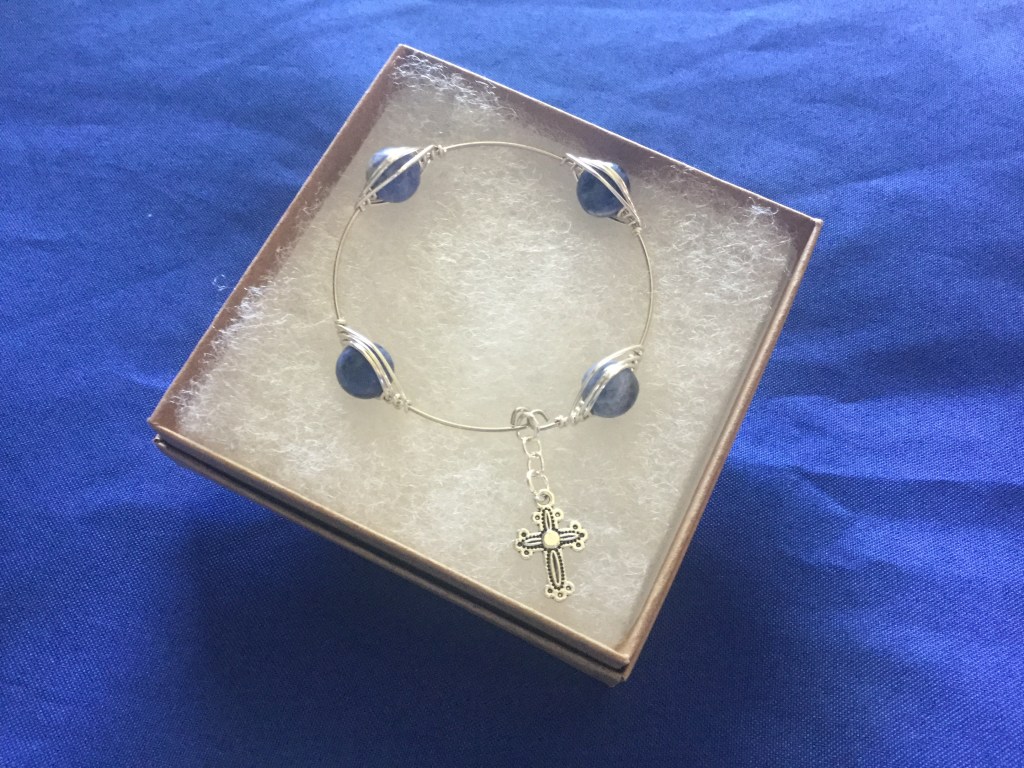 This Blessing Bracelet was designed as a reminder to think of and appreciate 4 blessings each day. Four Sodalite beads are created with a herringbone weave, strung on a memory wire, and embellished with a cross charm. Sodalite was originally discovered in Greenland in 1806. Larger deposits of gem quality material were found in Ontario, Canada in 1891. The beads are 10mm.