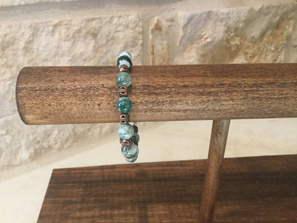 This bead bracelet was designed with care. It combines spacers and Green Tree Agate beads strung on a memory wire. Green Tree Agate is a form of dendritic agate. Meaning, that it is a chalcedony with dendrite inclusions of green minerals. Tree Agate is usually opaque white and does not have banding like traditional agates. This stone is found in Brazil, India, the U.S., and parts of Europe. The beads are 8mm.