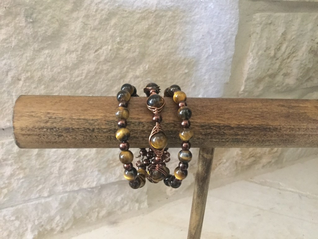 This unique Triple Strand Bead Bracelet was designed with care. It combines a herringbone weave strand and beads/spacers on the other strands. Tiger Eye is a popular quartz gemstone, that usually combines brown and black colors, that forms when fibers of the mineral crocidolite are replaced by silica. It displays a chatoyant quality when it is moved back and forth in light. The majority of tiger eye stones can be found in South Africa and Thailand. However, it can also be mined in several other countries including the US. Beads used on woven strand are 10mm. Beads used on single strands are 8 mm.