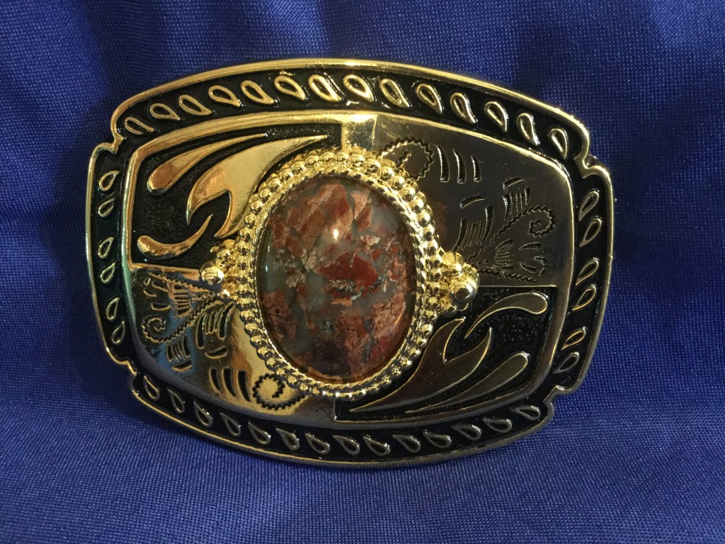 This Agate stone has been shaped and polished to enhance its appearance. The stone is a 30 x 40mm (1 1/2″ x 1 1/16″) oval. It has been placed in a 3 7/8″ x 3″ gold colored bezel on a black and gold western style buckle. The bezel is removable allowing one to interchange stones. Jasper and Agate are prevalent around the world.