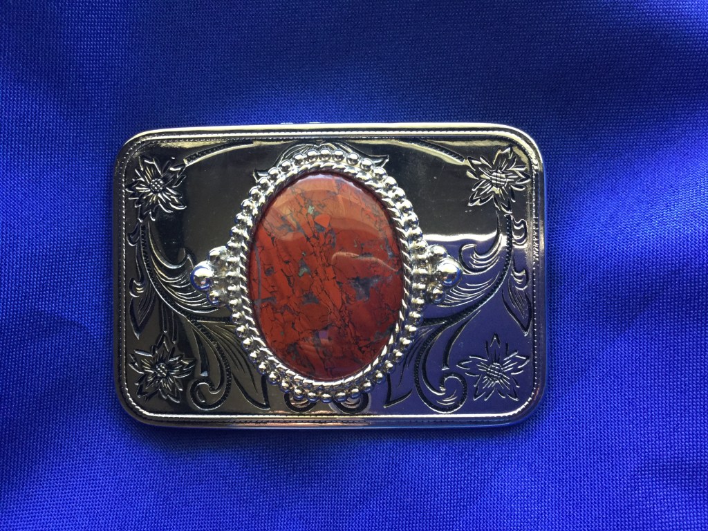 This Red Jasper has been shaped and polished to enhance its appearance. The stone is 30 x 40mm (1 ½” x 1 1/16”) oval. It has been set in a 3 1/4″ x 2 1/4″ silver colored bezel on a western style belt buckle. The bezel is removable which allows one to interchange stones. The stone’s red color is due to its high iron content. Jaspers are found worldwide and vary in design and color.