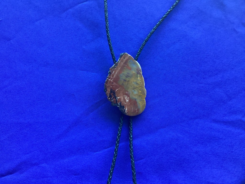 This Petrified Wood (approximately 1 7/8”W x 3 1/4”H) gemstone has been attached to a high-quality spring clip for easy cord adjustment. The 42” cord is black leather with bronze-colored tips. Petrified Wood is a term used for fossilized remains of trees or tree-like plants, where the cavities between natural wood cells are filled with minerals. The most famous locality where Petrified Wood can be observed is Petrified Forest National Park in Arizona.