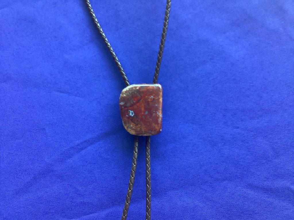 This Moss Agate (approximately 1 ¼”W x 1 ¾”H) gemstone has been attached to a high-quality spring clip for easy cord adjustment. The 36” cord is brown leather with silver-colored tips. Moss Agate is a translucent type of chalcedony that features a mossy, dendric, branching, or fern-like pattern, thus the name. This semi- precious stone gives an impression of a small landscape or tree captured inside the stone.