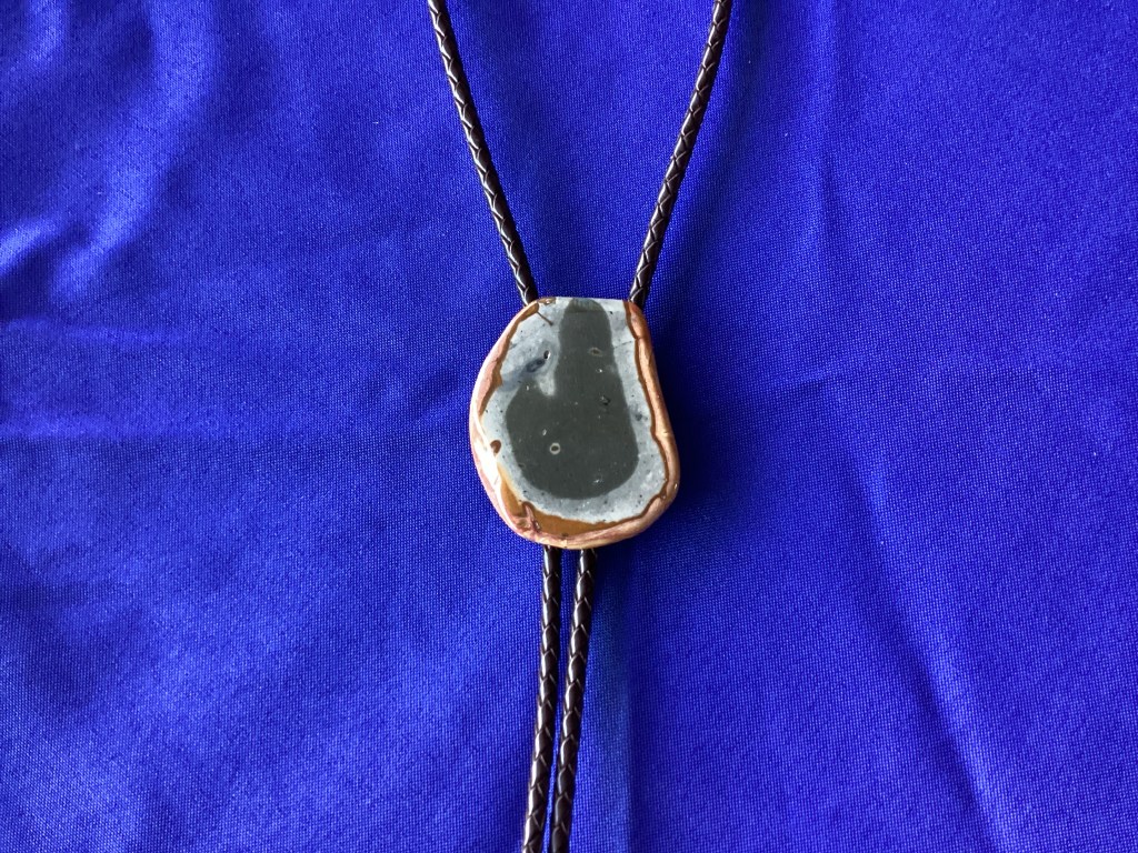 This beautiful Jasper (approximately 1 5/8”W x 2”H) gemstone has been attached to a high-quality spring clip for easy cord adjustment. The 36” cord is brown leather with gold-colored tips. Ocean Jasper comes in multiple colors and textures. It is only found is Madagascar. Originally it was located at low tide. It is a bit more valuable than other jaspers.