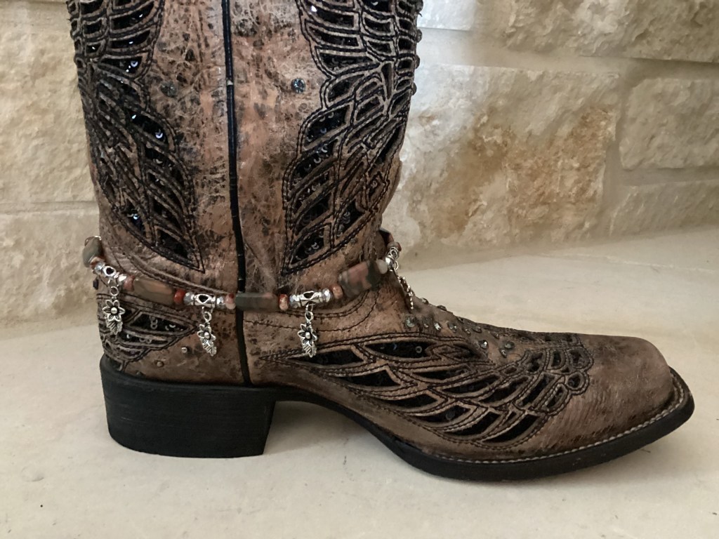 This handmade boot bracelet has been strung with 7 zebra jasper stones, 6 flower w/leaf charms, and embellished with brecciated jasper rondelles and bling beads. The bracelet is approximately 15” long with an adjustable lobster claw closure.