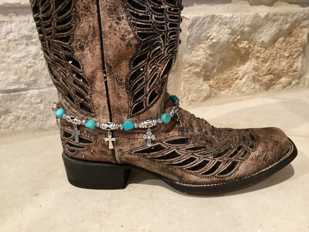This handmade boot bracelet has been strung with 7 magnasite nuggets, 6 cross charms, and embellished with bling beads. The bracelet is approximately 15” long with an adjustable lobster claw closure.