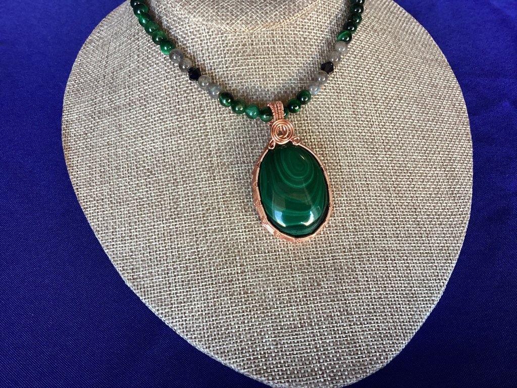 This gorgeous Malachite stone has been woven with you in mind. It has been woven with bright copper wire and strung on a 20” Green Tiger Eye and Labradorite (6mm beaded necklace. The necklace is also embellished with black bicone crystals. Malachite is a copper mineral recognized by its brilliant green color and dazzling bands. It is mined around the world but in the U.S., it can be found in Arizona, New Mexico, Utah, and Michigan. It is generally found in locales where copper mining is prevalent. Matching earrings available for $10.00.