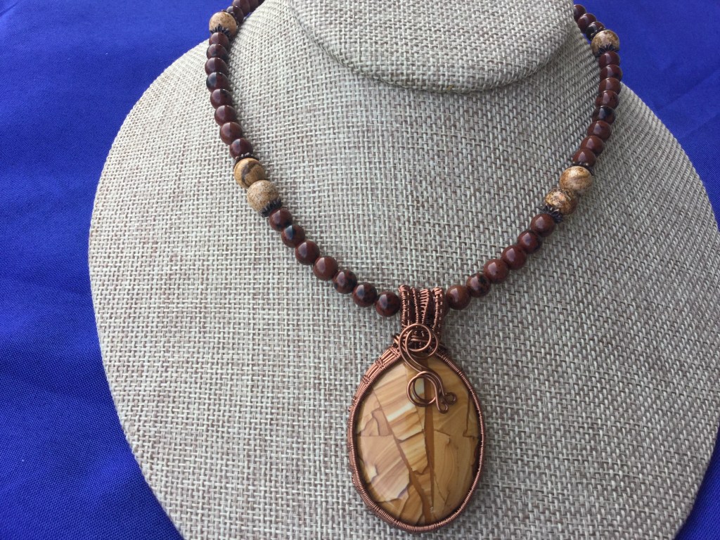 This Picture Jasper beauty has been woven with antique copper wire. It is strung on a 19” mahogany obsidian beaded necklace, accented with larger Picture Jasper beads. Jasper is an opaque variety of quartz. Its rustic appearance of banding and veining was created when silicate mud seeped into pockets in earliest volcanic rock. Large deposits of Picture Jasper have been located in Africa and Brazil.