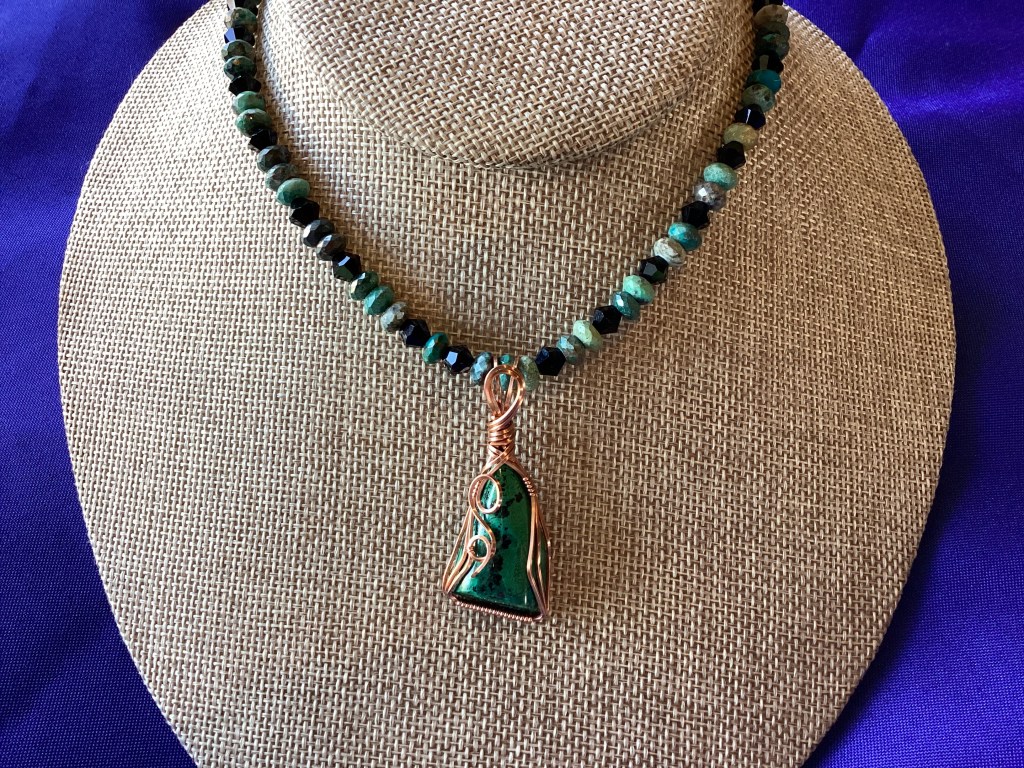 This Chrysocolla teardrop cutie has been designed as a choker. It has been wrapped with bright copper wire and strung on a 14” African Turquoise faceted rondelle beaded necklace and accented with black bicone crystals. Chrysocolla has a cyan (blue green) color and is associated with copper ore. It is a product found anywhere that copper is being mined..