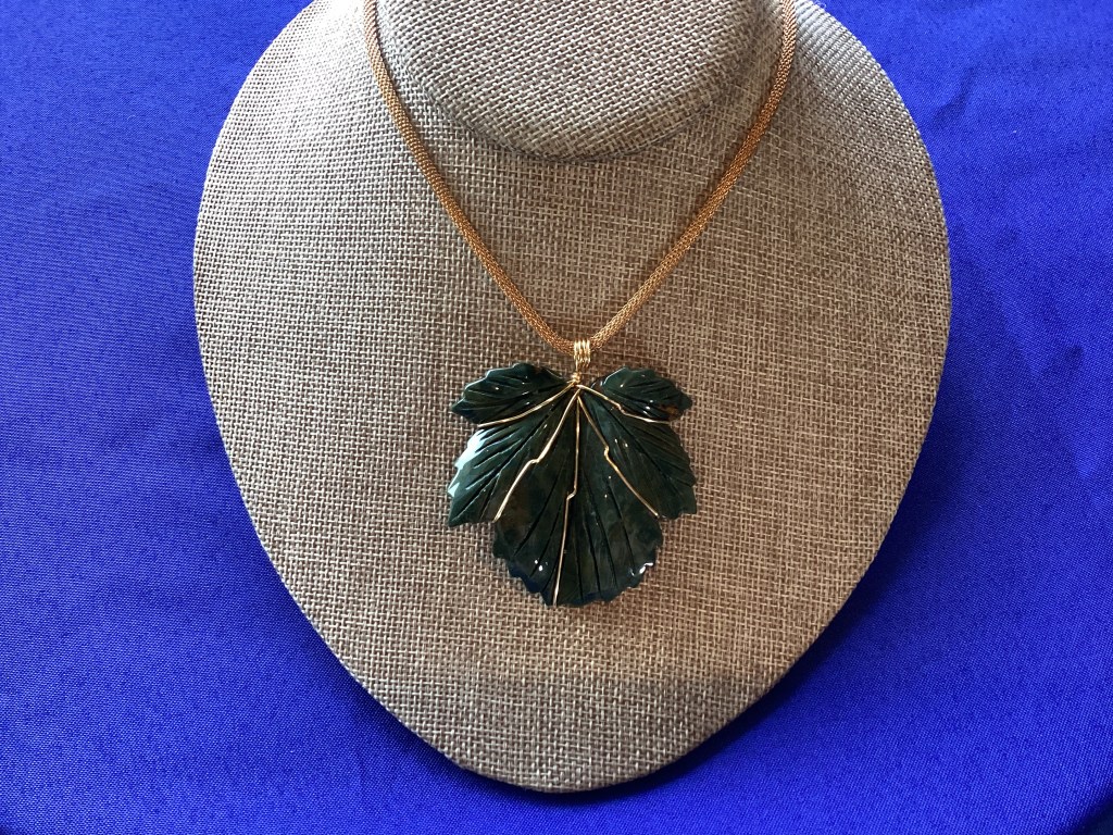 This Serpentine leaf has been wrapped with you in mind. It has been wrapped with gold colored copper wire and strung on a 16” or 18” (with an extender) gold colored mesh necklace. The name Serpentine comes from the greenish-brown color of this stone. It is the official state rock of California.