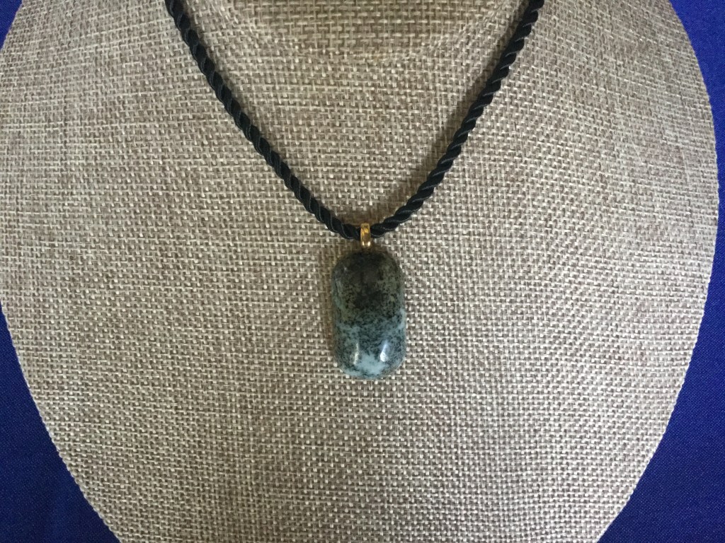 This Green Tree Agate has been designed with great care. It has been strung on an 18” black braided cloth necklace. Green Tree Agate is a form of dendritic agate. Meaning, that it is a chalcedony with dendrite inclusions of green minerals. Tree Agate is usually opaque white and does not have banding like traditional agates. This stone is found in Brazil, India, the U.S., and parts of Europe.