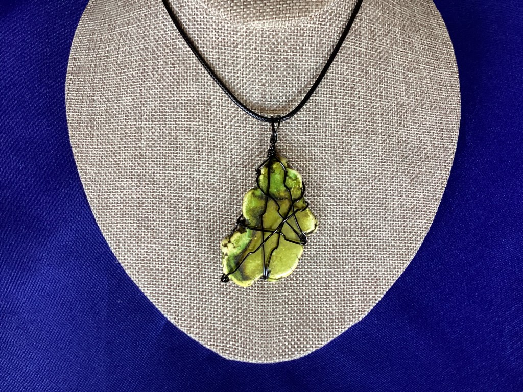 This Howlite has been designed for your enjoyment. It has been strung on a 24” black vinyl necklace and wrapped with black coated copper wire. Howlite was originally discovered in Canada but today large amounts are mined in California. Howlite is a porous stone and somewhat soft on the Mohs scale.
