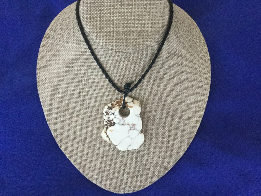 This natural color Magnasite, pendant necklace, has been designed with great care. The stone is core drilled and left with a live edge. It has been strung on an 18” black braided vinyl necklace. It’s an attractive stone that appears to have the same texture and veining as Howlite and Turquoise. The stone is soft and porous and therefore, is often dyed for jewelry.