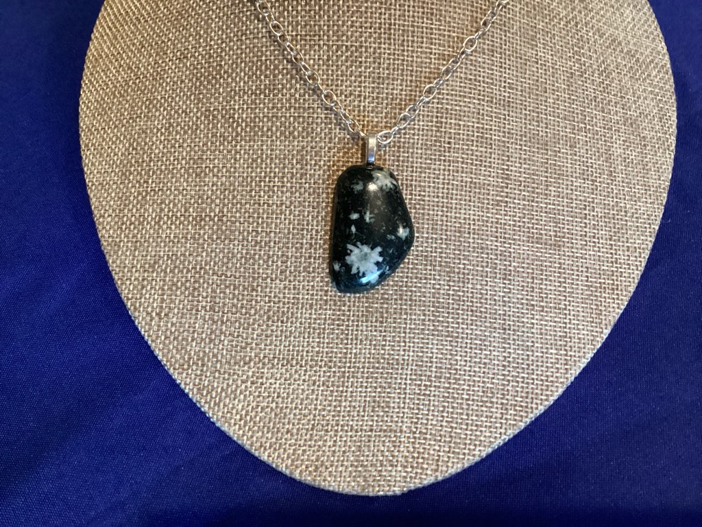 This Snowflake Obsidian pendant necklace has been designed just for you! It has been strung on an 18” silver plated braid chain. Snowflake Obsidian differs from true Obsidian via its patches of cloudy white or gray. Snowflake Obsidian can be found in Oregon and Utah.